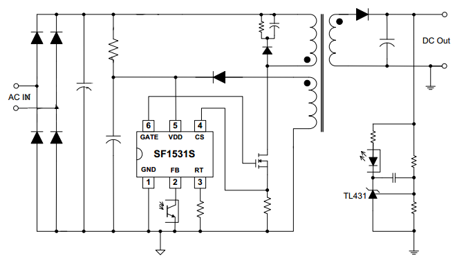 SF1531S集成了欠壓鎖定( UVLO ) , VCC過電壓保護(OVP )功能和保護,逐周期電流限製( OCP ) ,所有引腳浮保護,過負載保護( OLP ) , RT引腳短路到 接地保護,柵極鉗位, VCC鉗位,前沿消隱( LEB ) 。