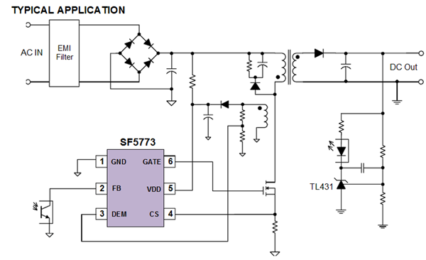 SF5773是第二代準諧振(QR)PWM控製器。SF5773適用於中小功率場合,SF5773可以實現100mW超低待機功耗。采用專利的“QR-II TM”技術克服了傳統準諧振係統效率,EMI,異音等缺陷,真正發揮了QR的技術潛力,能夠滿足六級能效的要求。