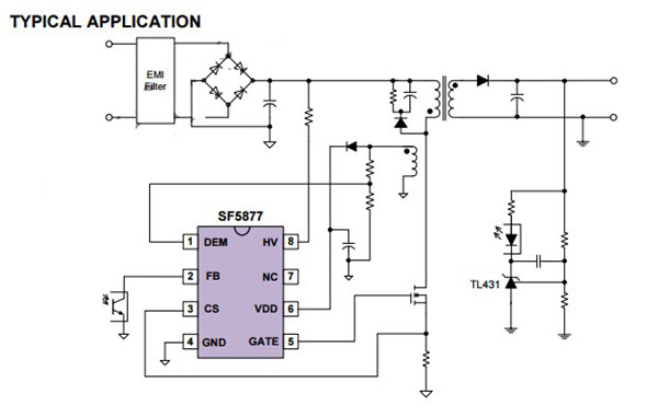 SF5877是多模式控製器。當滿負荷,該IC在CCM模式或QR模式的基礎上AC線路輸入的工作。當負載變低時,IC進入“數字頻率折返”的模式,以提高功率轉換效率。當輸出功率是非常小的,IC進入到突發模式,可以實現小於100mW的空載功率。
