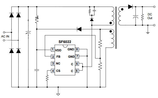 SF6022專有的“音頻降噪控製集成音頻噪聲自由操作。集成電路內置的“快速動態響應”控製來滿足USB充電的需求。SF6022還集成了專有的“零輸出啟動”控製來實現近零電壓啟動時輸出。IC的專有的“智能輸出短的保護”它可以保護你的係統輸出短路時大漏電感。