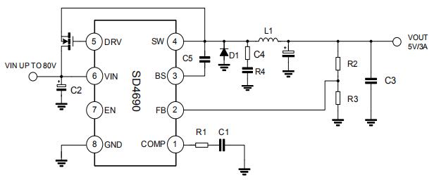 SD4690 80V dc-dc降壓芯片內置輕載降頻功能,可提升輕載效率;內置短路保護、過溫保護避免了芯片在超負荷負載或者溫度過熱時受到損壞;最高80KHz的工作頻率以及SOP-8封裝,最大限度的減小了整體解決方案的占板麵積。